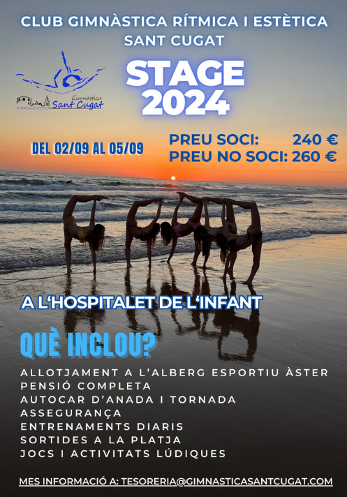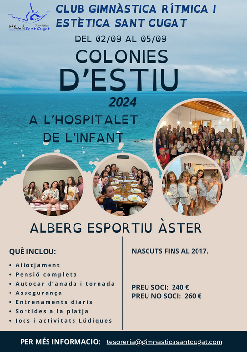 Del 2 al 5 de setembre, el Club Gimnstica Rtmica i Esttica Sant Cugat organitzar unes Colnies d’Estiu i un Stage a l’Hospitalet de L’Infant (Tarragona), a l’Alberg Esportiu ster.